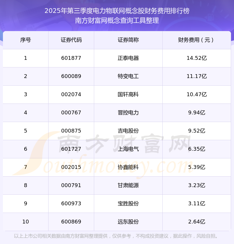 2025年第三季度,電力物聯(lián)網(wǎng)概念股財務費用排名如下:正泰電器(601877)的財務費用總額高達14.52億,特變電工(600089)和國軒高科(002074)分別位居第二和第三,晉控電力(000767)、吉電股份(000875)、上海電氣(601727)、協(xié)鑫能科(002015)、甘肅能源(000791)、寶勝股份(600973)、遠東股份(600869)分別進入前十,其財務費用總額分別排名第4-10名。