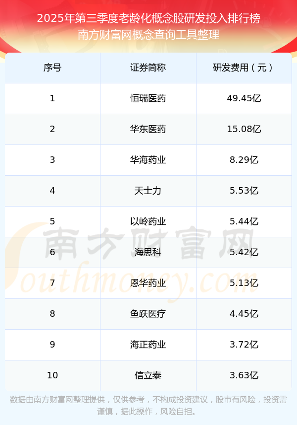 2025年第三季度,老齡化概念股研發(fā)投入排名如下:恒瑞醫(yī)藥(600276)研發(fā)投入總額高達(dá)49.45億,華東醫(yī)藥(000963)和華海藥業(yè)(600521)分別位居第二和第三,天士力(600535)、以嶺藥業(yè)(002603)、海思科(002653)、恩華藥業(yè)(002262)、魚躍醫(yī)療(002223)、海正藥業(yè)(600267)、信立泰(002294)分別進(jìn)入前十,其研發(fā)投入總額分別排名第4-10名。