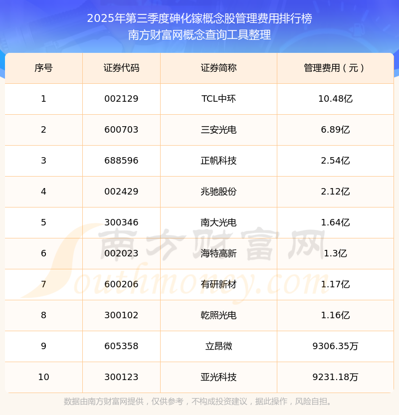 2025年第三季度,砷化鎵概念股管理費(fèi)用排行榜如下:TCL中環(huán)(002129)的管理費(fèi)用總額高達(dá)10.48億,三安光電(600703)和正帆科技(688596)分別排名第二和第三,兆馳股份(002429)、南大光電(300346)、海特高新(002023)、有研新材(600206)、乾照光電(300102)、立昂微(605358)、亞光科技(300123)分別進(jìn)入前十,其管理費(fèi)用總額分別排名第4-10名。