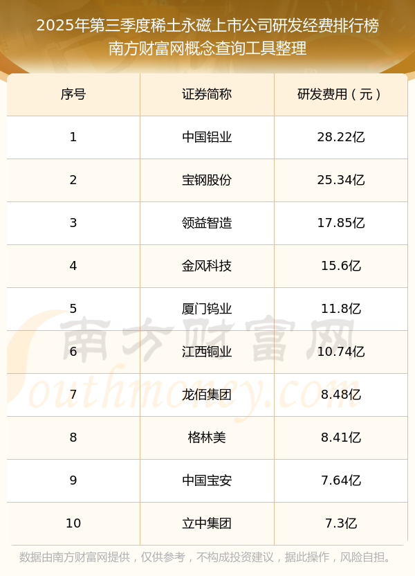 2025年第三季度稀土永磁上市公司研發(fā)經(jīng)費(fèi)排行榜如下:中國鋁業(yè)(601600)研發(fā)經(jīng)費(fèi)總額高達(dá)28.22億,寶鋼股份(600019)和領(lǐng)益智造(002600)分別位居第二和第三,金風(fēng)科技(002202)、廈門鎢業(yè)(600549)、江西銅業(yè)(600362)、龍佰集團(tuán)(002601)、格林美(002340)、中國寶安(000009)、立中集團(tuán)(300428)分別進(jìn)入前十,其研發(fā)經(jīng)費(fèi)總額分別排名第4-10名。