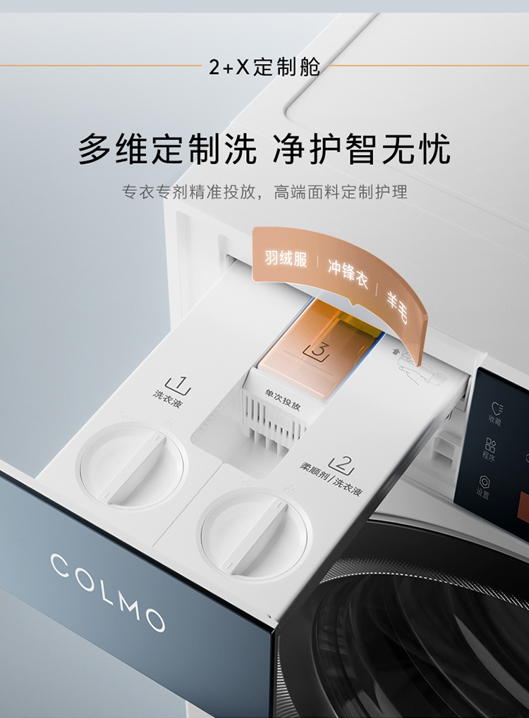 針對(duì)羽絨服、沖鋒衣、羊毛等高端面料的衣物護(hù)理,COLMO圖靈洗烘套裝T1pro,創(chuàng)新搭載2+X定制艙,提供專衣專劑,智能精準(zhǔn)投放,并配備AI智洗科技,能智能感知衣物重量,匹配洗滌劑投放量、洗滌時(shí)長(zhǎng)等,為用戶帶來(lái)不同面料多維定制護(hù)理解決方案。