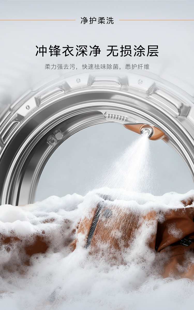 通過(guò)高壓螺旋初混、增速預(yù)旋細(xì)混、高速吸氣霧混三級(jí)全預(yù)混模式,實(shí)現(xiàn)AI配比恒定濃度,讓水與專屬洗滌液融合更充分,并在微米級(jí)慕斯高壓噴淋洗加持下,深層滲透衣物纖維瓦解頑固污漬,同時(shí)在AI智洗模式下,AI凈態(tài)眼,能夠智能判斷水中污濁度,漂凈即停,確保衣物防護(hù)涂層無(wú)損傷,為高端面料衣物凈洗帶來(lái)細(xì)膩呵護(hù)。