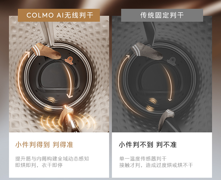 針對(duì)傳統(tǒng)干衣機(jī)采用單一溫度傳感器判干,接觸才判斷衣物的干濕狀態(tài),小件衣物根本判不到、判不準(zhǔn),造成過(guò)度烘或烘不干的現(xiàn)象。面對(duì)這一用戶困擾,COLMO圖靈洗烘套裝T1pro創(chuàng)新搭配AI無(wú)線判干技術(shù),首創(chuàng)將濕度傳感器置于不銹鋼提升筋上,通過(guò)11組電極片全面貼合智能感知衣物濕度,搭載AI穿透烘MEMS2.0濕度感知更精準(zhǔn),即便是小件衣物也能判得到、判得準(zhǔn);同時(shí)結(jié)合無(wú)線傳能技術(shù),實(shí)現(xiàn)3檔顏色燈光干濕狀態(tài)可視化,烘干進(jìn)度一目了然,隨心調(diào)控防止過(guò)烘;針對(duì)羊毛、真絲、襯衫等不同面料衣物定制烘干方案,智能感知?jiǎng)討B(tài)烘護(hù),以專業(yè)級(jí)護(hù)理,真正做到衣干即停,溫潤(rùn)護(hù)衣。