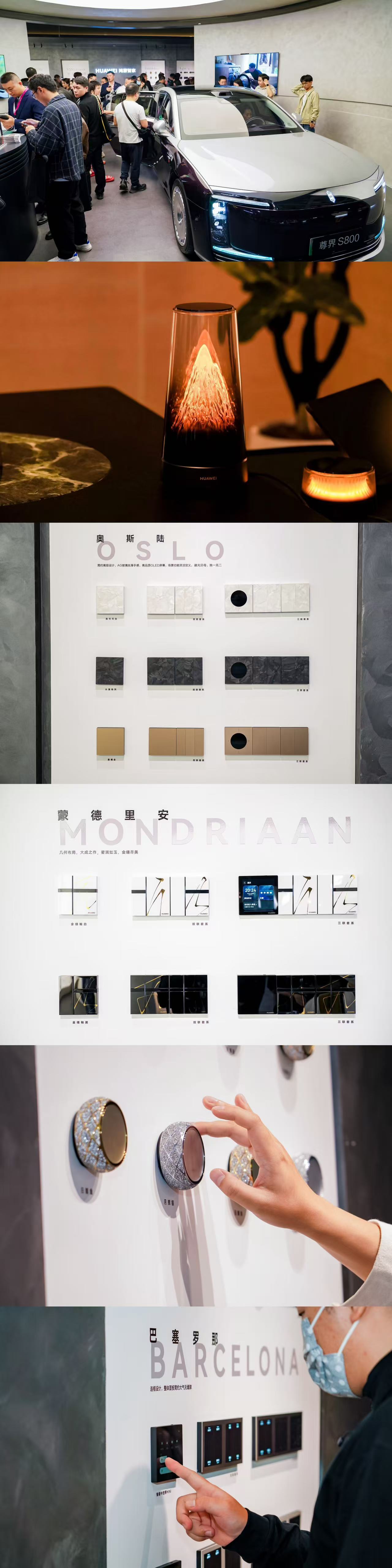 在宏大的敘事基座之上,策展中多個極致的華為產(chǎn)品設(shè)計,憑借獨(dú)特的審美與交互魅力,自發(fā)成為社交媒體上炙手可熱的“打卡符號”。鴻蒙智行尊界S800不僅是“家”的敘事起點(diǎn),其“移動空間”的前置性家居顛覆理念,在以家空間為聚焦的展會上成為獨(dú)樹一幟的打卡熱點(diǎn)。在生活場景區(qū),“日照金山”微縮于機(jī)身的華為路由X3 Pro 日照金山的奇觀,迅速吸引觀眾的鏡頭特寫聚焦,成為最圈粉大眾的單品。而一系列的高端智能面板則是設(shè)計師們的偏愛,流轉(zhuǎn)著貝母光澤的奧斯陸系列、演繹理性幾何的蒙德里安系列、復(fù)刻宇宙浪漫的日月星鉆系列,以及擁有建筑流動感的巴塞羅那系列,成為被反復(fù)觸摸的“墻面藝術(shù)品”。從現(xiàn)場打卡到社交刷屏,華為單品無疑成為洞察趨勢的視覺符號。
