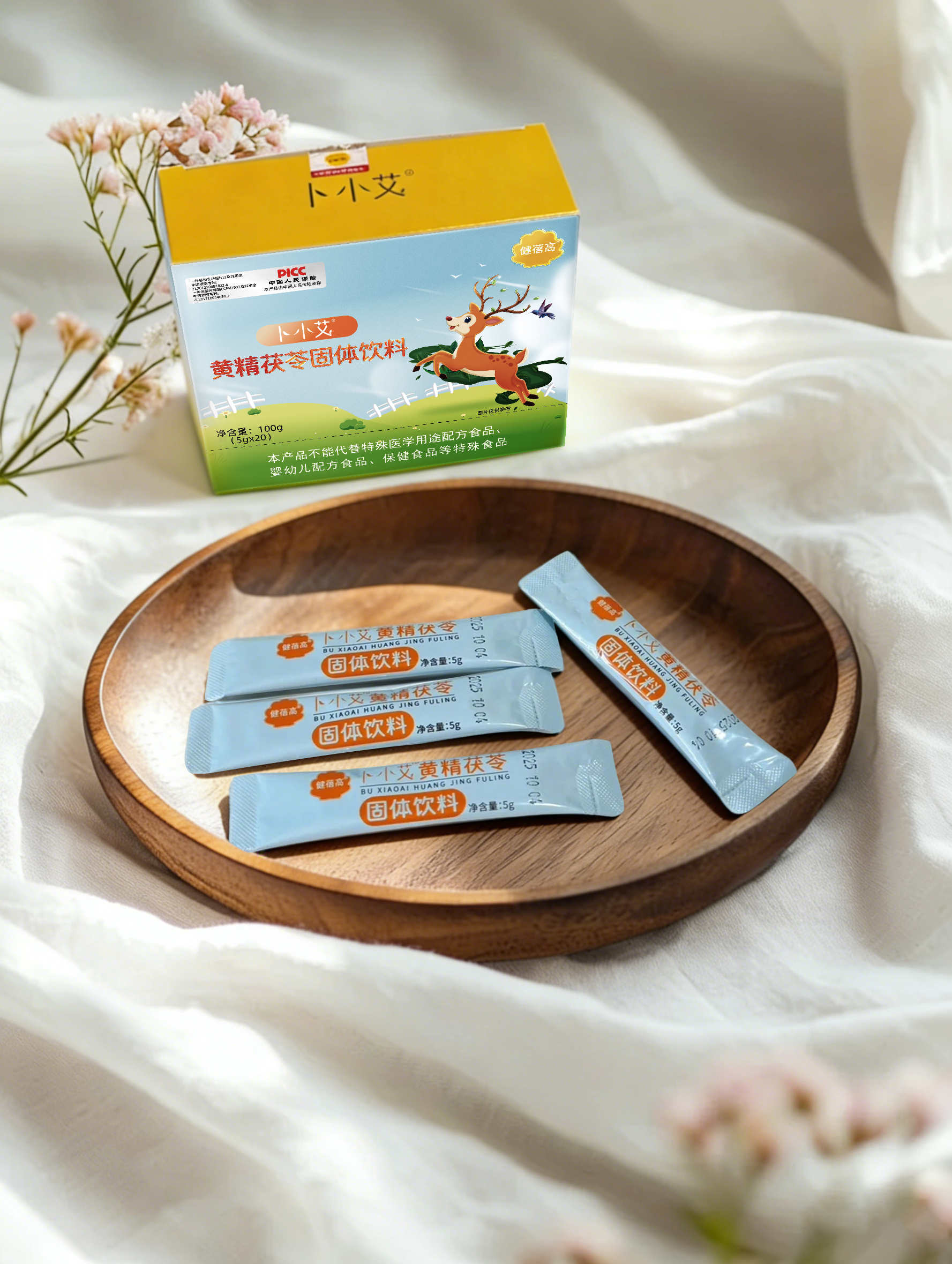 卜小艾????,每天兩袋,主要源于草本????甘草、山藥、黃精、甘竹、梔子、刺梨果、茯苓七味藥材,還添加了兩種益生菌。