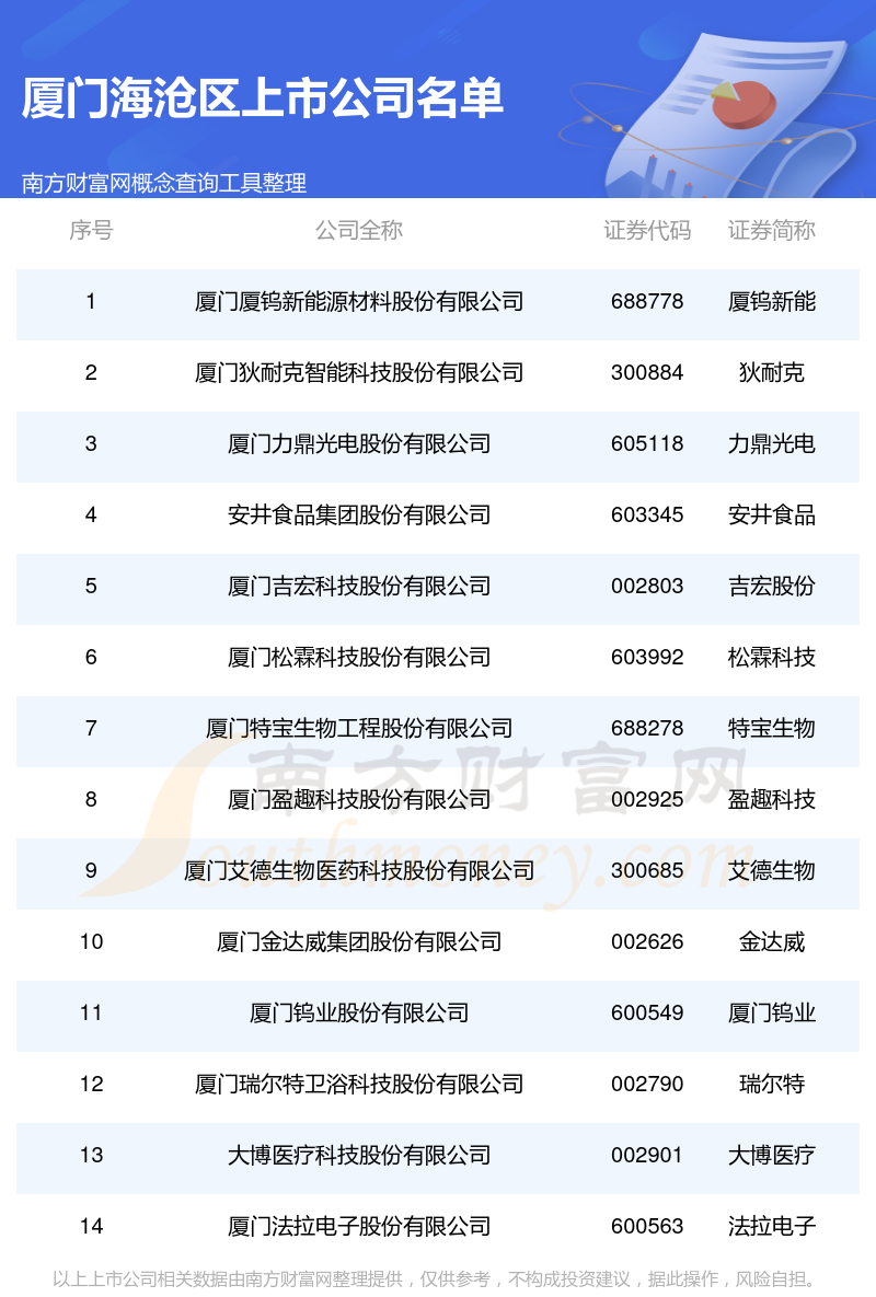 數(shù)量上,截至12月7日,廈門(mén)海滄區(qū)共有14家A股上市公司。其中,在上海證券交易所上市的有廈門(mén)鎢業(yè)、法拉電子、安井食品、松霖科技、力鼎光電、特寶生物、廈鎢新能等7家,在深圳證券交易所上市的有7家:金達(dá)威、瑞爾特、吉宏股份、大博醫(yī)療、盈趣科技、艾德生物、狄耐克等。