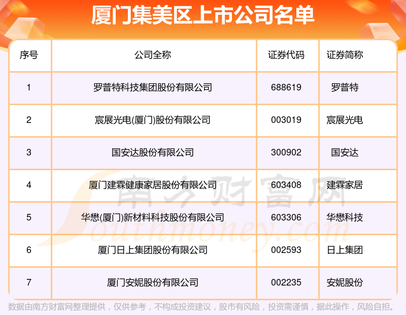 從數(shù)量來(lái)看,截至12月7日,廈門集美區(qū)共有7家A股上市公司。其中,在上海證券交易所上市的有華懋科技、建霖家居、羅普特等3家,在深圳證券交易所上市的有4家:安妮股份、日上集團(tuán)、宸展光電、國(guó)安達(dá)等。