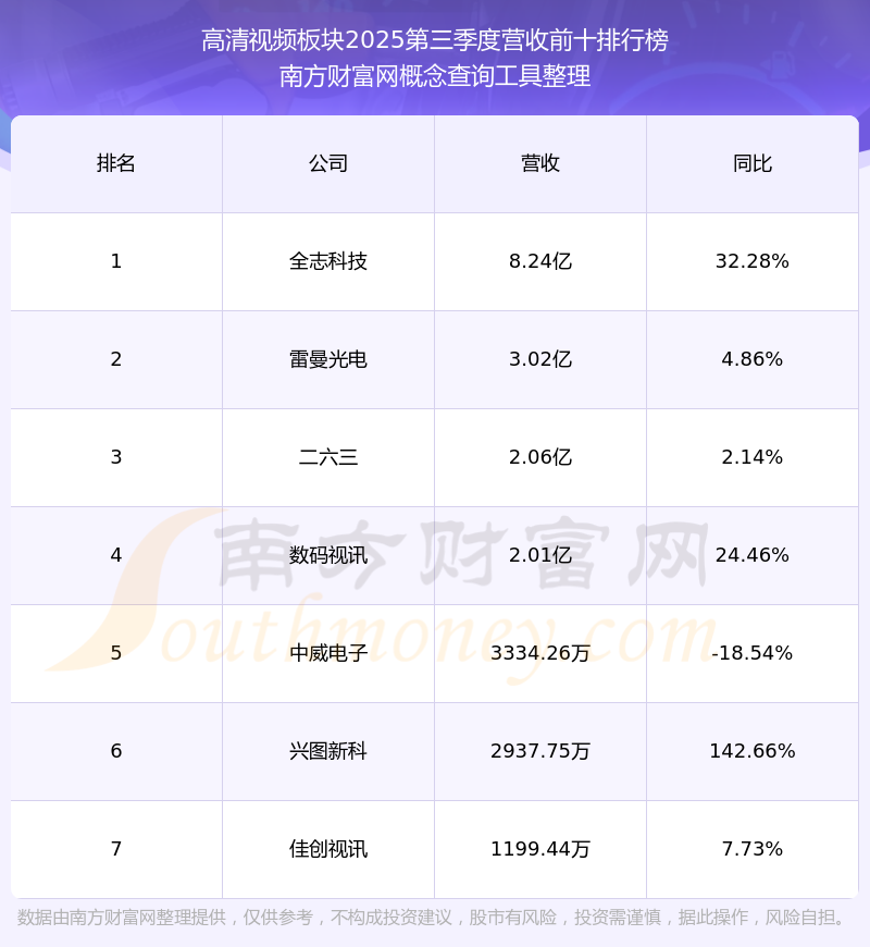 按照南方財(cái)富網(wǎng)概念查詢工具統(tǒng)計(jì),該股所屬板塊為高清視頻板塊,該板塊共有7只股票,網(wǎng)達(dá)軟件2025第三季度營收在該板塊中排名為第7名,該板塊2025第三季度營收排名前十的股票如下表: