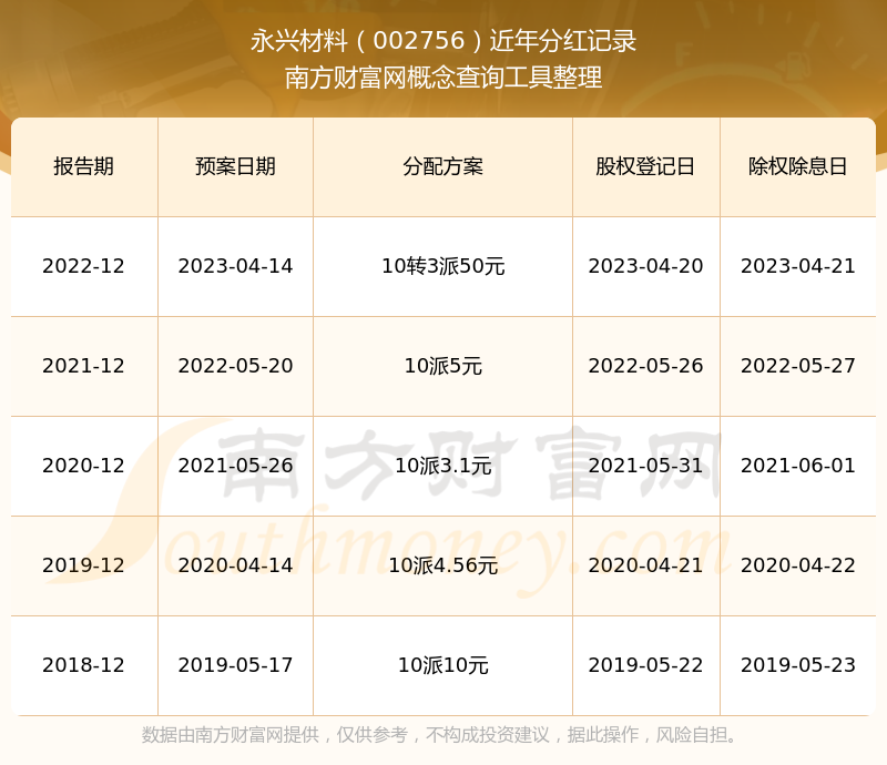 永興材料最新一次公布的分紅方案為10轉(zhuǎn)3派50元。本次權(quán)益分派股權(quán)登記日為2023年4月20日,除權(quán)除息日為2023年4月21日,派息日為2023年4月21日。