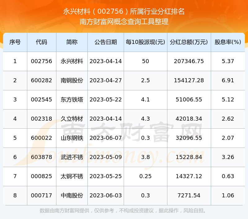 按照南方財(cái)富網(wǎng)趨勢選股系統(tǒng)統(tǒng)計(jì),永興材料所屬行業(yè)為碳酸鋰行業(yè),碳酸鋰行業(yè)分紅排名情況如下表: