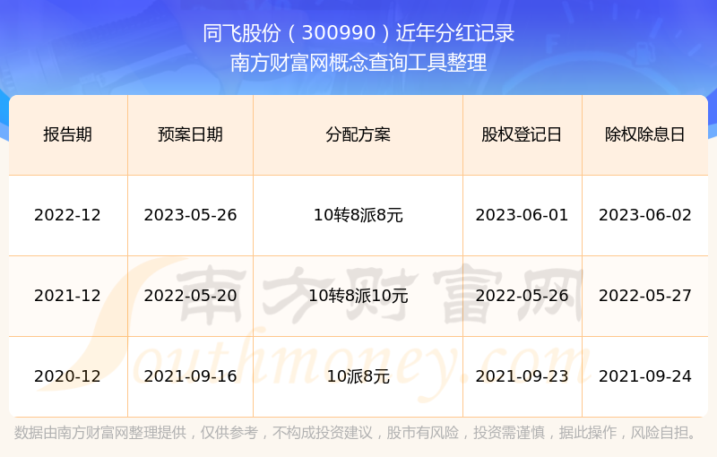 同飛股份歷年分紅派息情況如下表所示: