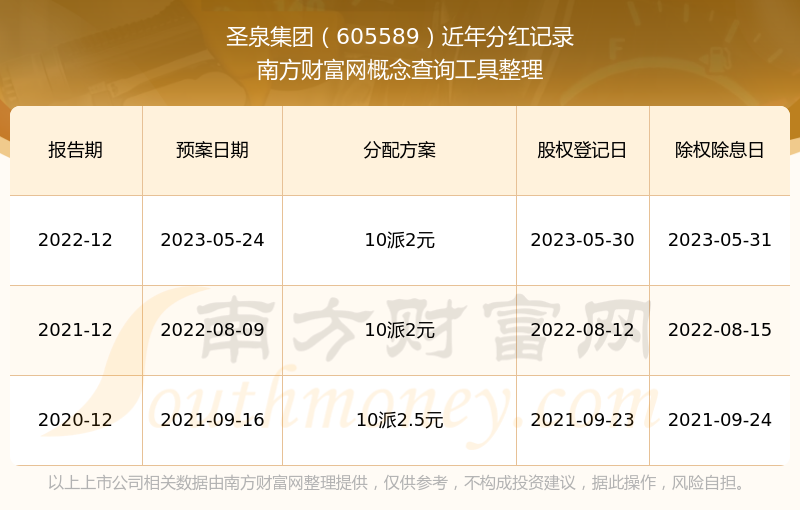 圣泉集團(tuán)最新一次公布的分紅方案為10派2元。本次權(quán)益分派股權(quán)登記日為2023年5月30日,除權(quán)除息日為2023年5月31日,派息日為2023年5月31日。