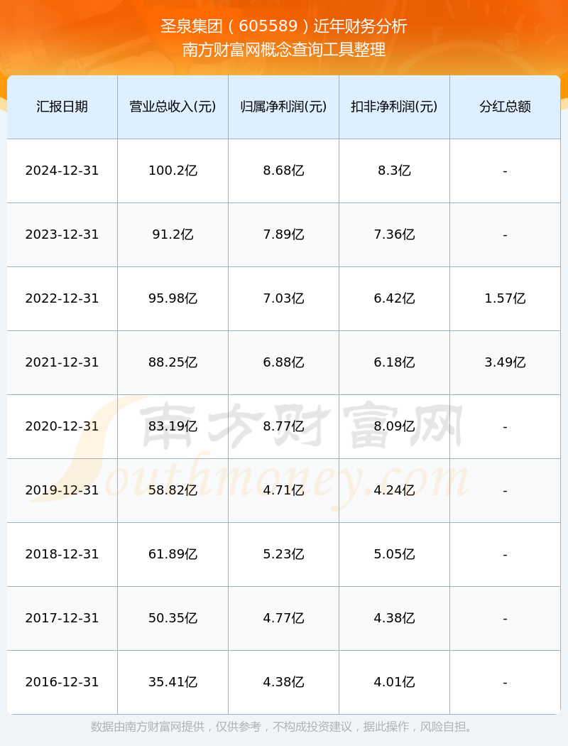 2024年圣泉集團(tuán)總營收100.2億,同比增長9.87%;凈利潤8.68億,同比增長9.94%;銷售毛利率23.61%。