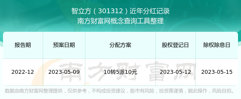 智立方最新一次公布的分紅方案為10轉(zhuǎn)5派10元。本次權(quán)益分派股權(quán)登記日為2023年5月12日,除權(quán)除息日為2023年5月15日,派息日為2023年5月15日。