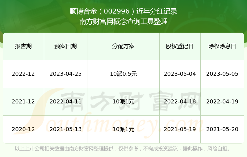 順博合金最新一次公布的分紅方案為10派0.5元。本次權(quán)益分派股權(quán)登記日為2023年5月4日,除權(quán)除息日為2023年5月5日,派息日為2023年5月5日。