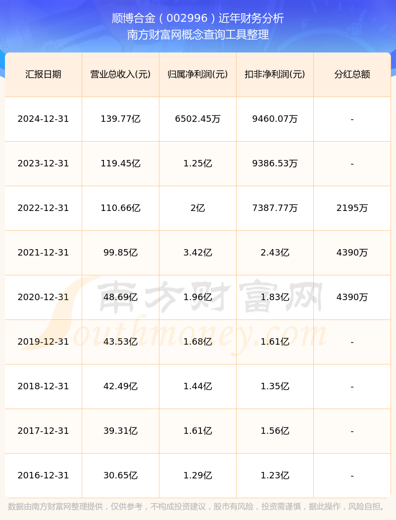 順博合金2024年總營收139.77億,同比增長17.01%;凈利潤6502.45萬,同比增長-47.96%;銷售毛利率3.15%。