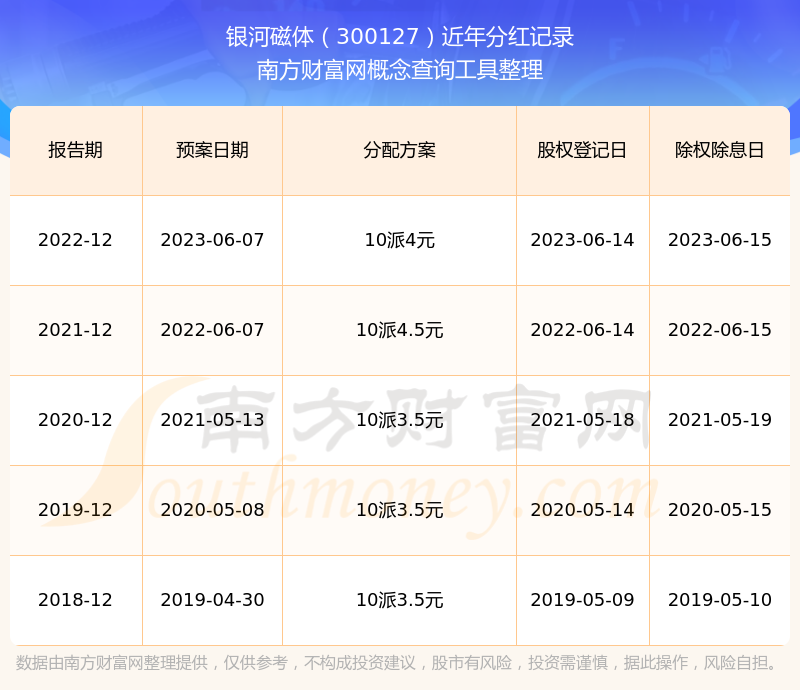 銀河磁體最新一次公布的分紅方案:10派4元。