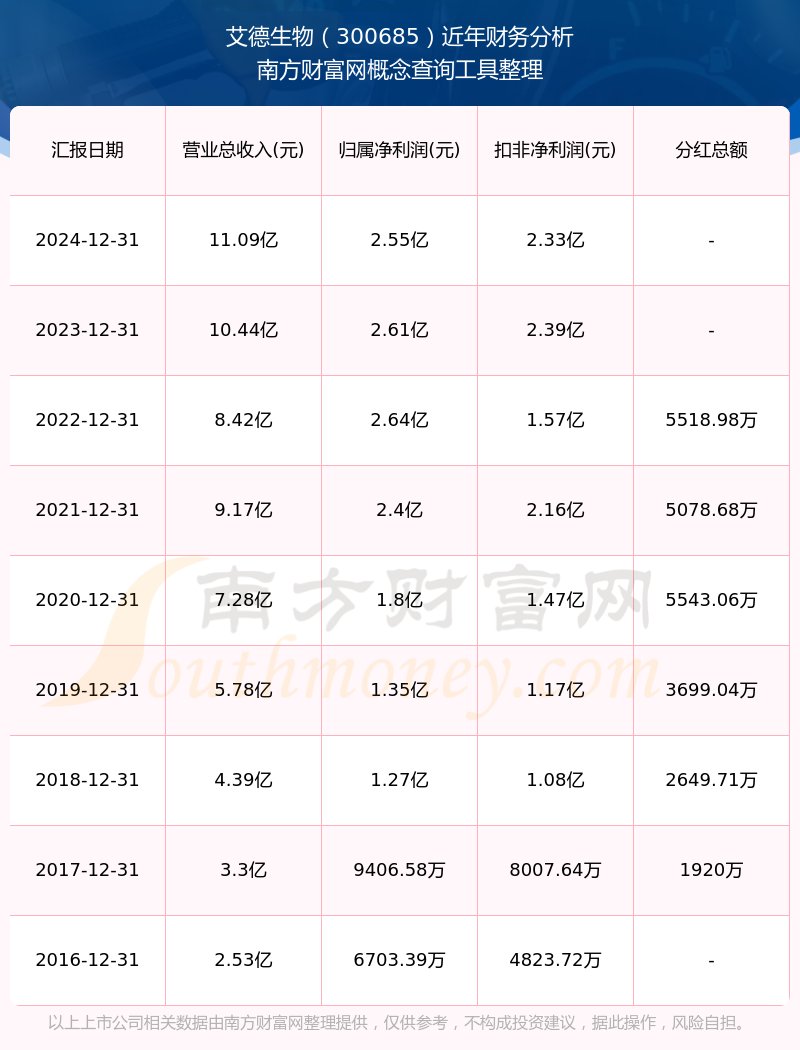 艾德生物公司2024年實現(xiàn)營收11.09億元,凈利潤2.55億元,毛利率84.75%。