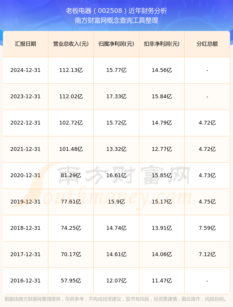 老板電器公司2024年實(shí)現(xiàn)營收112.13億元,凈利潤15.77億元,毛利率49.66%。