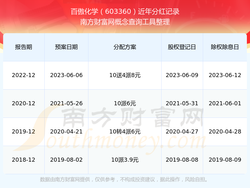 百傲化學(xué)最新一次公布的分紅方案:10送4派8元。