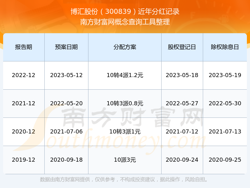 博匯股份最新一次公布的分紅方案為10轉(zhuǎn)4派1.2元。本次權(quán)益分派股權(quán)登記日為2023年5月18日,除權(quán)除息日為2023年5月19日,派息日為2023年5月19日。