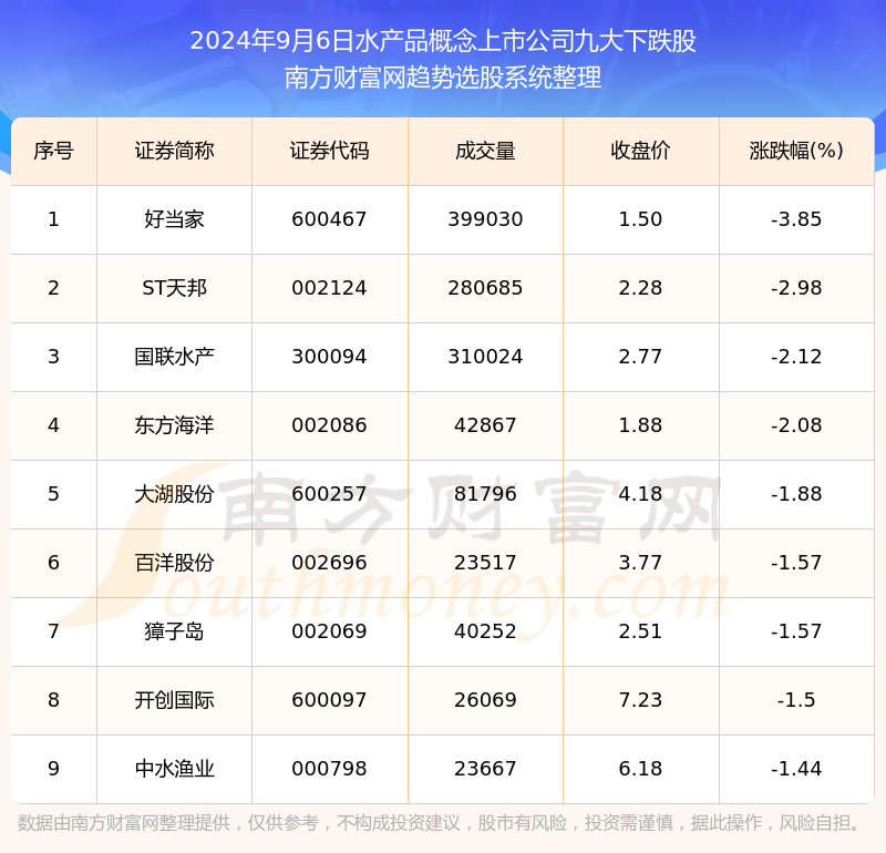 2024年9月6日盤后數(shù)據(jù):水產(chǎn)品概念上市公司九大熊股