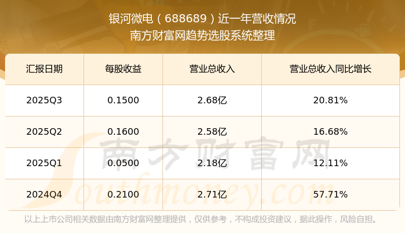 在2025年第三季度,銀河微電的業(yè)績表現(xiàn),主營業(yè)務(wù)收入達(dá)到2.68億元,實(shí)現(xiàn)了20.81%的同比增長率。同時(shí),公司歸母凈利潤錄得1907.1萬元,同比增長88.94%。