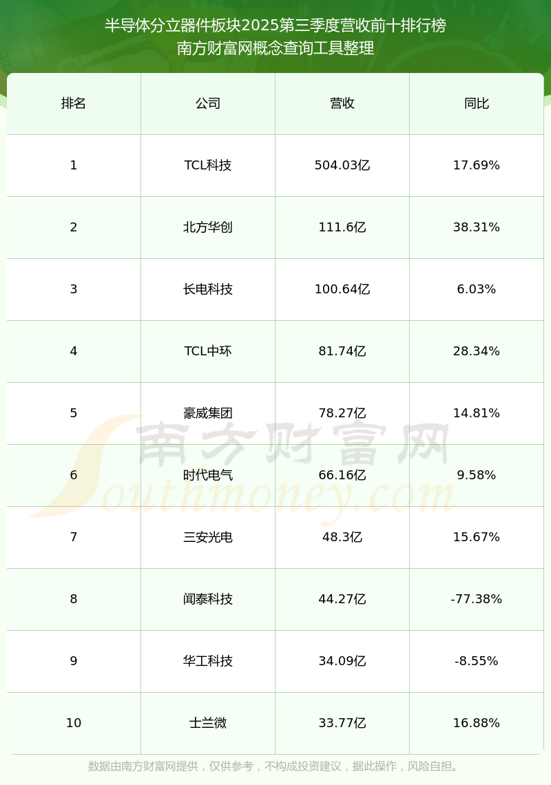 按照南方財(cái)富網(wǎng)概念查詢工具統(tǒng)計(jì),該股所屬板塊為半導(dǎo)體分立器件板塊,該板塊共有67只股票,銀河微電2025第三季度營收在該板塊中排名為第53名,該板塊2025第三季度營收排名前十的股票如下表: