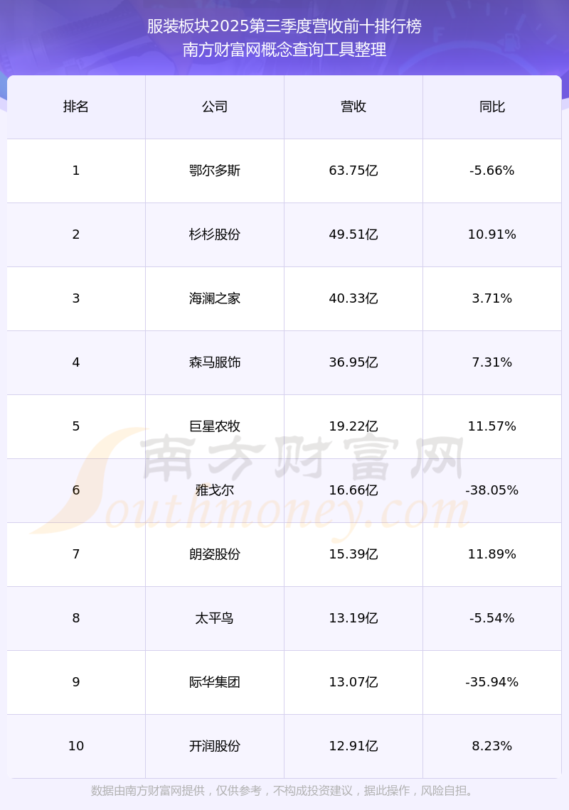 按照南方財富網(wǎng)概念查詢工具統(tǒng)計,該股所屬板塊為服裝板塊,該板塊共有62只股票,日播時尚2025第三季度營收在該板塊中排名為第47名,該板塊2025第三季度營收排名前十的股票如下表: