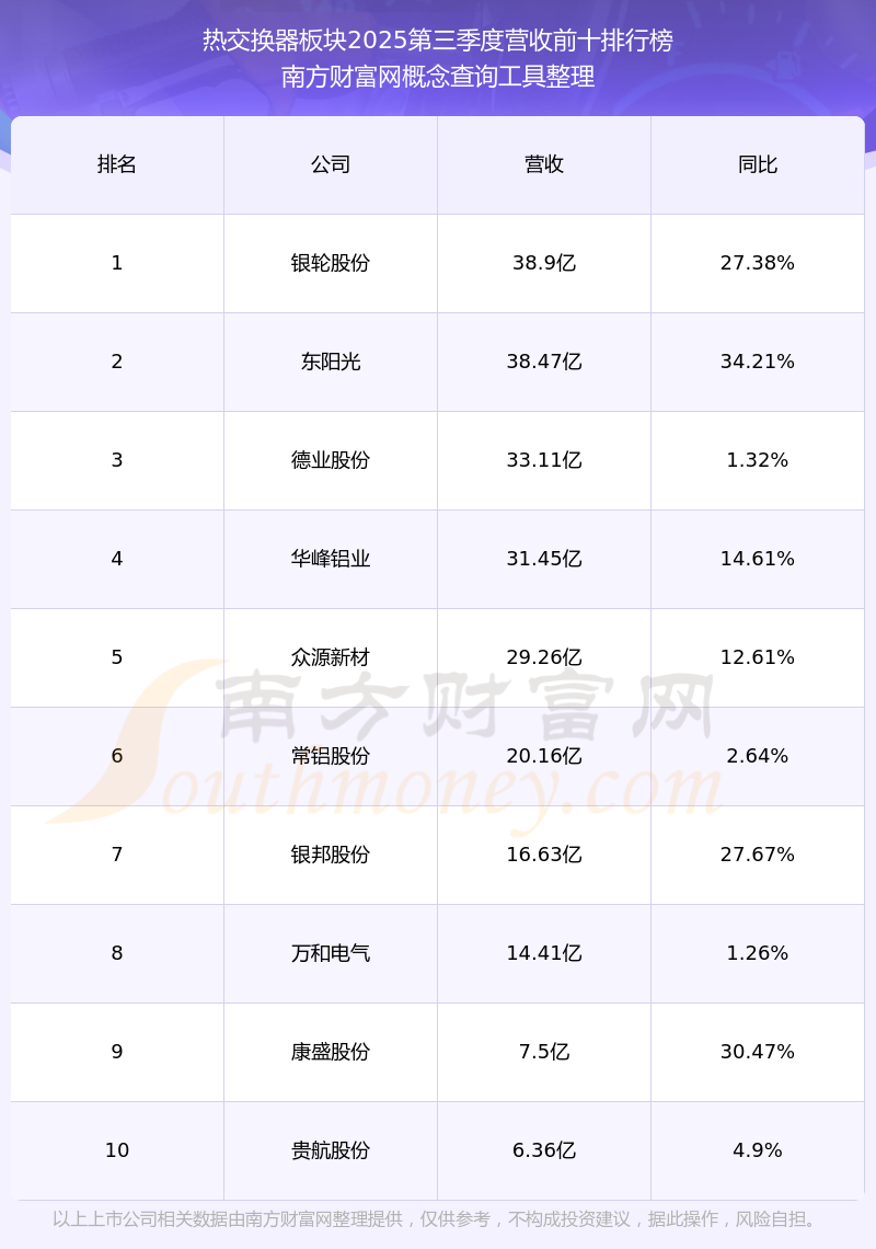 按照南方財(cái)富網(wǎng)概念查詢工具統(tǒng)計(jì),該股所屬板塊為熱交換器板塊,該板塊共有15只股票,德業(yè)股份2025第三季度營(yíng)收在該板塊中排名為第3名,該板塊2025第三季度營(yíng)收排名前十的股票如下表: