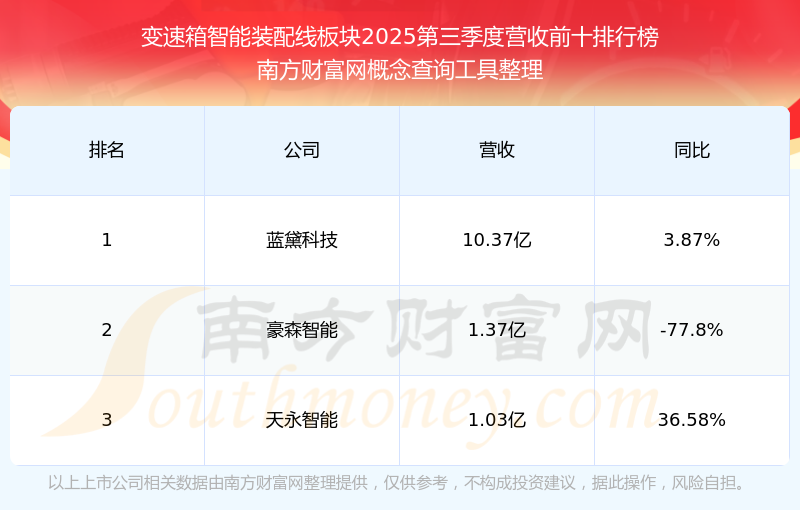 按照南方財富網(wǎng)概念查詢工具統(tǒng)計,該股所屬板塊為變速箱智能裝配線板塊,該板塊共有3只股票,豪森智能2025第三季度營收在該板塊中排名為第2名,該板塊2025第三季度營收排名前十的股票如下表: