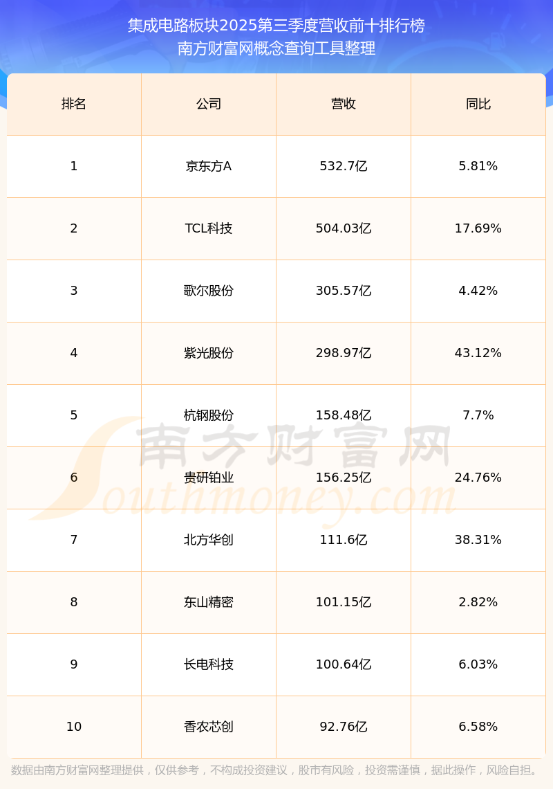 按照南方財富網(wǎng)概念查詢工具統(tǒng)計,該股所屬板塊為集成電路板塊,該板塊共有192只股票,瑞芯微2025第三季度營收在該板塊中排名為第69名,該板塊2025第三季度營收排名前十的股票如下表: