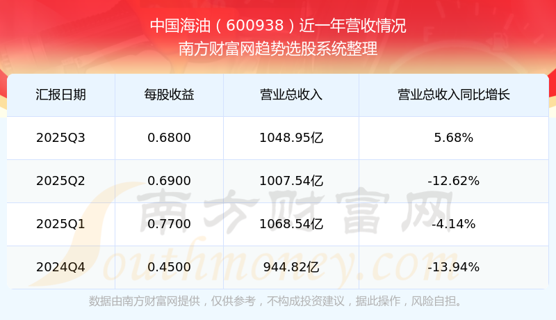 在2025年第三季度,中國海油的業(yè)績表現(xiàn),主營業(yè)務(wù)收入達到1048.95億元,實現(xiàn)了5.68%的同比增長率。同時,公司歸母凈利潤錄得324.38億元,同比增長-12.16%。