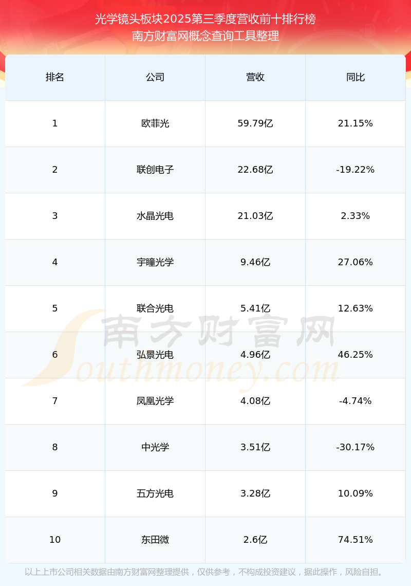 按照南方財富網(wǎng)概念查詢工具統(tǒng)計,該股所屬板塊為光學(xué)鏡頭板塊,該板塊共有19只股票,中潤光學(xué)2025第三季度營收在該板塊中排名為第14名,該板塊2025第三季度營收排名前十的股票如下表: