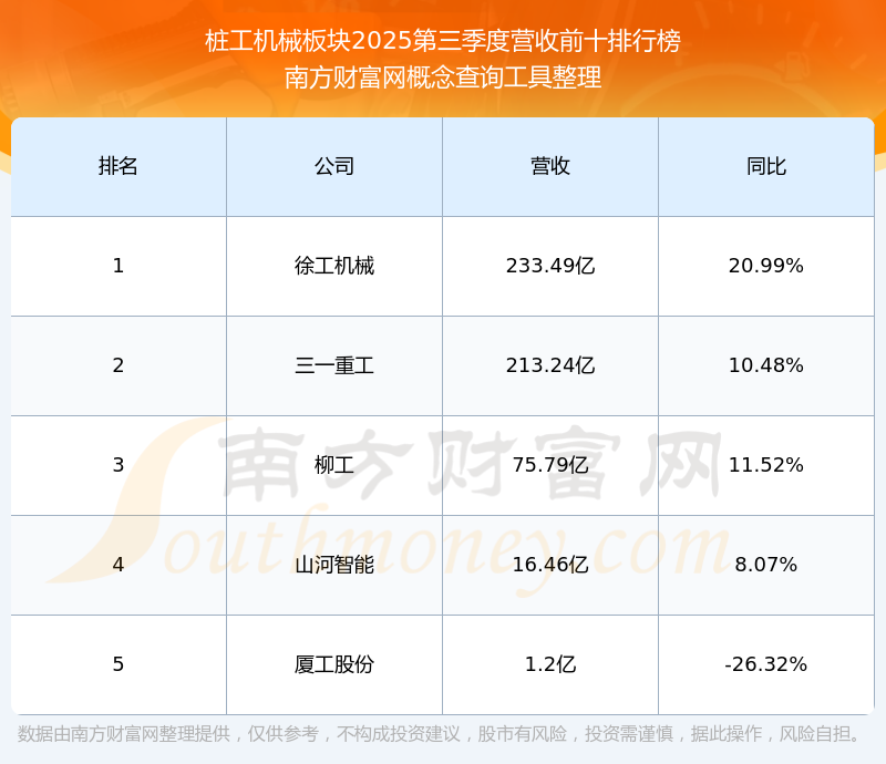 按照南方財(cái)富網(wǎng)概念查詢工具統(tǒng)計(jì),該股所屬板塊為樁工機(jī)械板塊,該板塊共有5只股票,三一重工2025第三季度營(yíng)收在該板塊中排名為第2名,該板塊2025第三季度營(yíng)收排名前十的股票如下表: