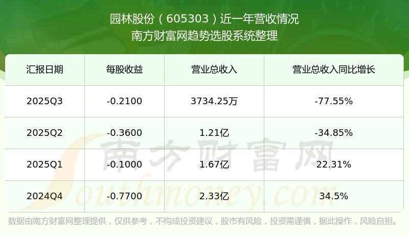 園林股份2025年第三季度顯示,公司主營收入3734.25萬元,同比-77.55%;歸母凈利潤-3430.63萬元,同比-574.35%;扣非凈利潤-3635.72萬元,同比-456.75%;
