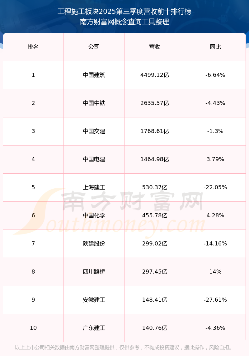 按照南方財富網(wǎng)概念查詢工具統(tǒng)計,該股所屬板塊為工程施工板塊,該板塊共有56只股票,園林股份2025第三季度營收在該板塊中排名為第56名,該板塊2025第三季度營收排名前十的股票如下表:
