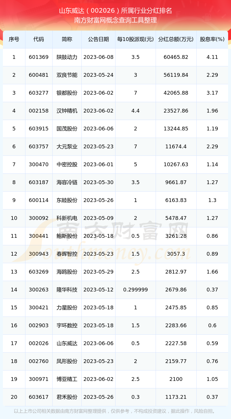 二、山東威達(dá)002026行業(yè)分紅排名