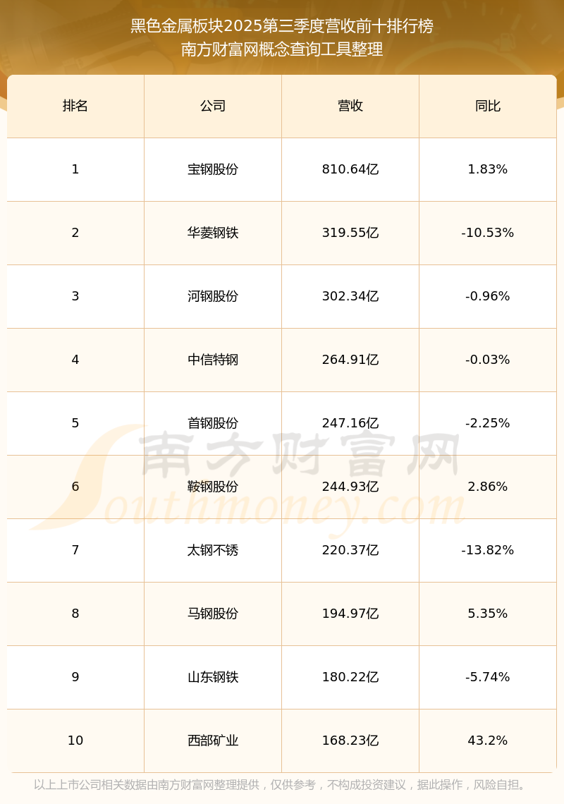 按照南方財(cái)富網(wǎng)概念查詢工具統(tǒng)計(jì),該股所屬板塊為黑色金屬板塊,該板塊共有38只股票,中信金屬2025第三季度營收在該板塊中排名為第38名,該板塊2025第三季度營收排名前十的股票如下表:
