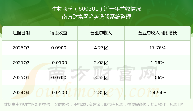生物股份(600201)發(fā)布2025年第三季度財報。2025年第三季度生物股份實現(xiàn)營業(yè)收入4.23億元,同比增加17.76元%,環(huán)比增加57.78%;凈利潤為1.01億元,同比增長116.4%,環(huán)比增長728.31%。