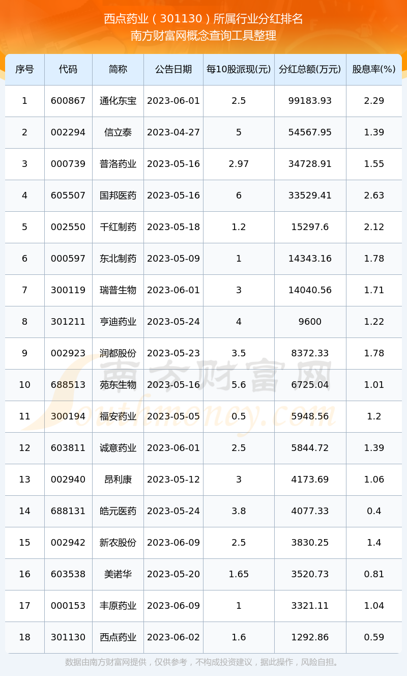 二、西點(diǎn)藥業(yè)301130行業(yè)分紅排名