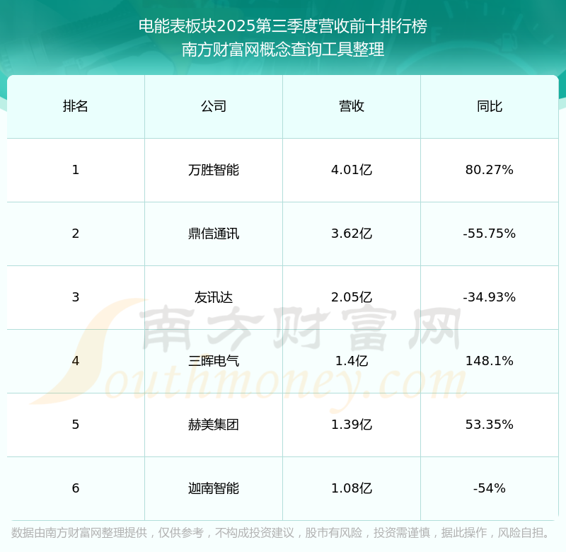 按照南方財(cái)富網(wǎng)概念查詢工具統(tǒng)計(jì),該股所屬板塊為電能表板塊,該板塊共有6只股票,林洋能源2025第三季度營(yíng)收在該板塊中排名為第6名,該板塊2025第三季度營(yíng)收排名前十的股票如下表: