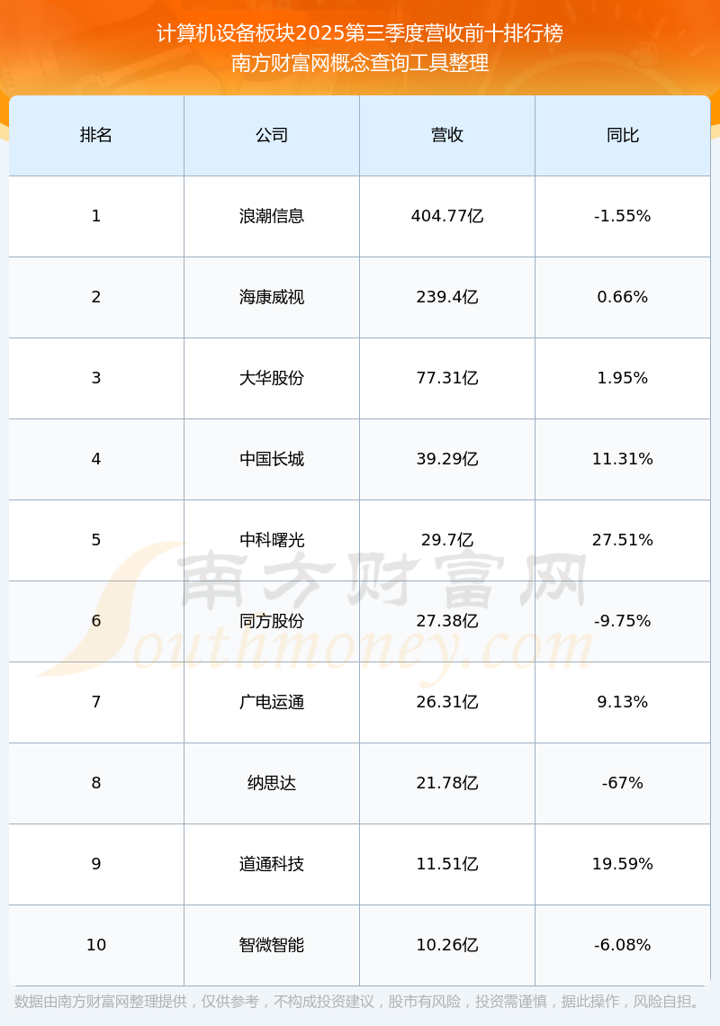 按照南方財富網(wǎng)概念查詢工具統(tǒng)計(jì),該股所屬板塊為計(jì)算機(jī)設(shè)備板塊,該板塊共有61只股票,中科曙光2025第三季度營收在該板塊中排名為第5名,該板塊2025第三季度營收排名前十的股票如下表: