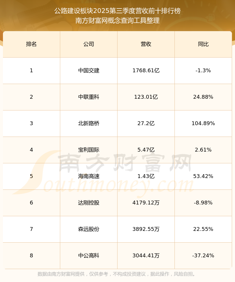 按照南方財(cái)富網(wǎng)概念查詢工具統(tǒng)計(jì),該股所屬板塊為公路建設(shè)板塊,該板塊共有8只股票,中原高速2025第三季度營(yíng)收在該板塊中排名為第8名,該板塊2025第三季度營(yíng)收排名前十的股票如下表:
