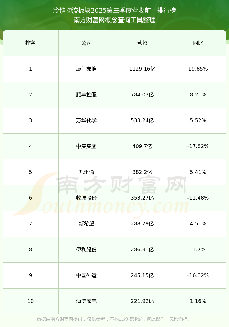 按照南方財富網概念查詢工具統(tǒng)計,該股所屬板塊為冷鏈物流板塊,該板塊共有146只股票,暢聯(lián)股份2025第三季度營收在該板塊中排名為第114名,該板塊2025第三季度營收排名前十的股票如下表:
