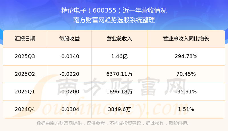 按照南方財富網概念查詢工具統(tǒng)計,該股所屬板塊為電子設備板塊,該板塊共有397只股票,精倫電子2025第三季度營收在該板塊中排名為第331名,該板塊2025第三季度營收排名前十的股票如下表: