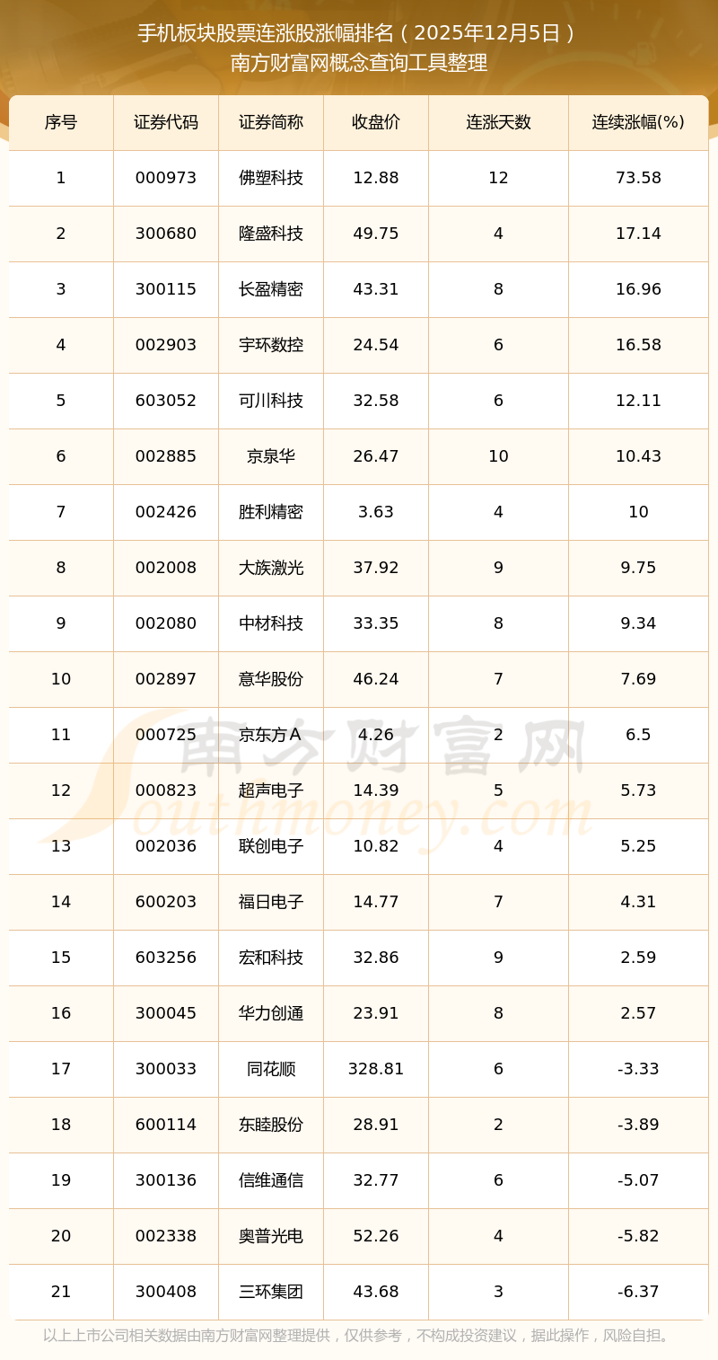 根據(jù)南方財富網(wǎng)概念查詢工具數(shù)據(jù)統(tǒng)計,截止2025年12月5日收盤,手機板塊股票共有21只個股實現(xiàn)連漲。其中連續(xù)漲幅較大的個股有佛塑科技、隆盛科技、長盈精密等,連續(xù)漲幅分別為73.58%、17.14%、16.96%。