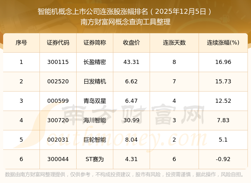 根據南方財富網概念查詢工具數據統(tǒng)計,截止2025年12月5日收盤,智能機概念上市公司共有6只個股實現(xiàn)連漲。其中連續(xù)漲幅較大的個股有長盈精密、日發(fā)精機、青島雙星等,連續(xù)漲幅分別為16.96%、15.73%、12.52%。