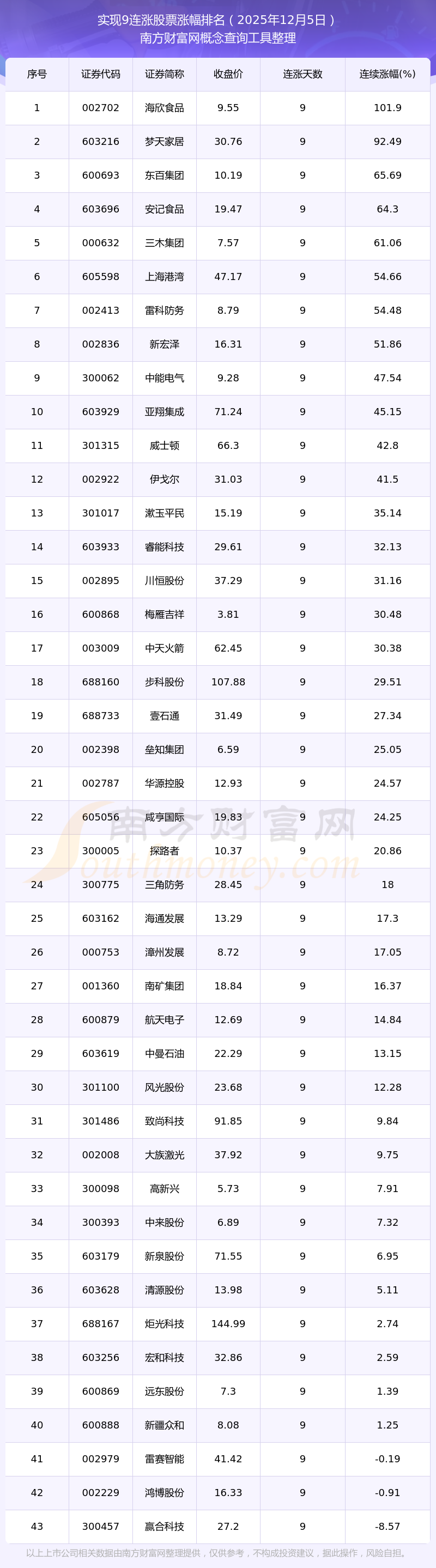 根據(jù)南方財(cái)富網(wǎng)概念查詢工具數(shù)據(jù)統(tǒng)計(jì),截止2025年12月5日收盤,共有43只個(gè)股實(shí)現(xiàn)9天連漲。其中連續(xù)漲幅較大的個(gè)股有海欣食品、夢天家居、東百集團(tuán)等,連續(xù)漲幅分別為101.90%、92.49%、65.69%。