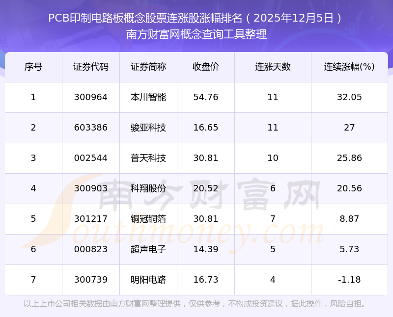 根據南方財富網概念查詢工具數據統(tǒng)計,截止2025年12月5日收盤,PCB印制電路板概念股票共有7只個股實現連漲。其中連續(xù)漲幅較大的個股有本川智能、駿亞科技、普天科技等,連續(xù)漲幅分別為32.05%、27.00%、25.86%。
